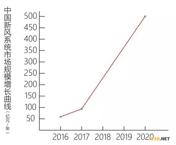 據(jù)統(tǒng)計(jì),2016年中國新風(fēng)系統(tǒng)市場(chǎng)規(guī)模為61億元,2017年將達(dá)到90億元,同比增長(zhǎng)了近50%。按這個(gè)速度發(fā)展下去,到2020年,中國新風(fēng)行業(yè)規(guī)?;?qū)⑦_(dá)到500億元。