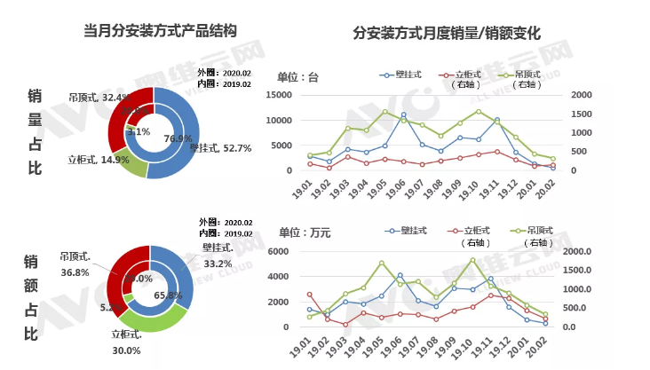 據(jù)奧維云網(wǎng) (AVC)數(shù)據(jù)監(jiān)測,2020年2月,線上新風市場的銷量除了在立柜式產(chǎn)品中有所突破外,其余類型皆呈下降狀態(tài)。立柜式產(chǎn)品銷量為150臺,占總銷量的14.9%,占比較去年2月增加11.8個百分點,銷量同比增長105.5%,相比今年1月份也增長了26.1%。吊頂式并未延續(xù)上月良好走勢,總體銷量為327臺,同比下降31.4%,環(huán)比下降26%,但銷量占比卻比去年同期增加了12.4個百分點,占32.4%。壁掛式銷量大幅下降,為531臺,占52.7%,同比銷量下降71.1%。在銷售額方面,三種安裝方式已經(jīng)較為接近,立柜式、吊頂式與壁掛式分別為:282.6萬,346.6萬和312.3萬,銷售額占比分別為30%,36.8%,和33.2%。與去年同期來看,壁掛式銷額占比縮小一半,立柜式則增長了近25個百分點。