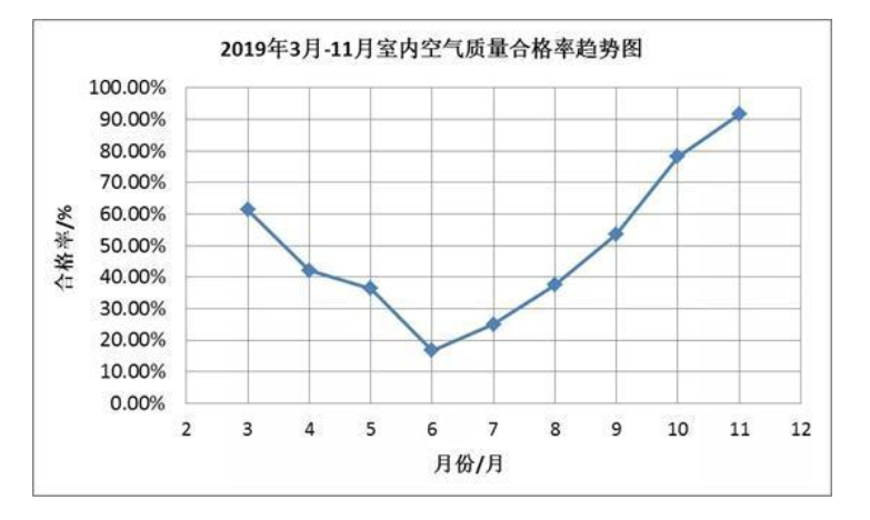檢測(cè)活動(dòng)從3月-11月。從檢測(cè)結(jié)果來看,夏季合格率明顯低于春、秋。詳見下圖。