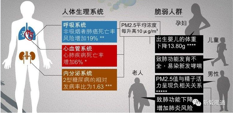 第三重:肺泡膜,組織粘液,免疫細(xì)胞,絕大部分直徑在0.5—2.5um的顆粒物都在這里被攔截,pm2.5會(huì)引發(fā)塵肺病、肺炎、肺結(jié)核甚至肺癌,哪怕不導(dǎo)致生病,這些顆粒物會(huì)堵塞部分肺泡,影響人體呼吸效率,嚴(yán)重的會(huì)導(dǎo)致氣短、缺氧等癥狀。