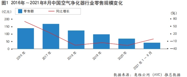 縱觀整個(gè)家電行業(yè),受新冠疫情影響,2021年絕大多數(shù)家電品類對比2020年同期,零售規(guī)模都有一定幅度的增長??諝鈨艋魇且粋€(gè)例外,零售規(guī)模和2020年幾乎持平。奧維云網(wǎng)(AVC)推總數(shù)據(jù)顯示,2021年1~8月,空氣凈化器(包括戴森凈化風(fēng)扇)全渠道零售規(guī)模為39.7億元,同比下降0.4%??諝鈨艋髌奉惲闶凼袌鼋?jīng)過連續(xù)3年大幅下滑,開始步入“底部橫盤”的階段(見圖1)。