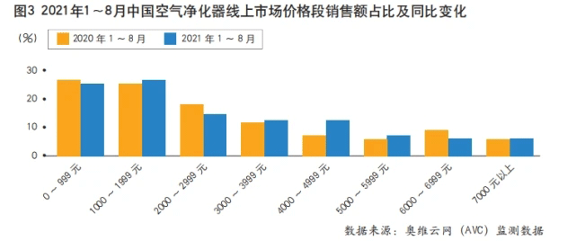 從價(jià)格段分布來看,空氣凈化器線上市場仍以高性價(jià)比的產(chǎn)品為主,2000元以下產(chǎn)品占比接近50%(見圖3)。但是,可以明顯看到,中高價(jià)位段產(chǎn)品銷量增長顯著,尤其是3000~6000元價(jià)位段產(chǎn)品,還有7000元以上的產(chǎn)品,市場占比都有一定幅度的增長。在線下市場,空氣凈化器價(jià)格呈現(xiàn)正態(tài)分布,3000元以下價(jià)格段產(chǎn)品占比下降,3000元以上部分中高端價(jià)格段產(chǎn)品占比提高(見圖4)。