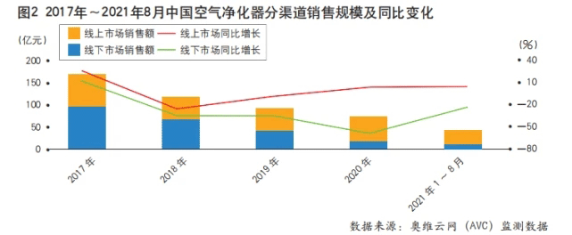 與此同時(shí),空氣凈化器的替代產(chǎn)品的銷量卻在快速增長。與空氣凈化器功能最為相關(guān)的新風(fēng)空調(diào)今年以來快速上量。奧維云網(wǎng)(AVC)監(jiān)測數(shù)據(jù)顯示,2021年1~8月,新風(fēng)空調(diào)線上市場和線下市場零售規(guī)模分別為4.9億元和11.9億元,同比分別增長607%和60%。