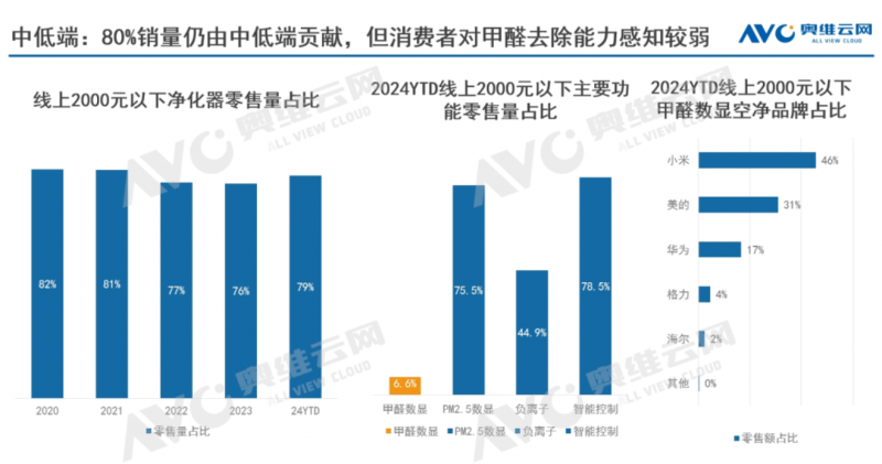 就當前形勢而言,空氣凈化器的核心需求仍舊是除甲醛需求,然而從產品層面來看,占據銷量近8成的大眾產品中,甲醛數顯零售量占比僅為6.6%,現階段這一功能在中低端市場的覆蓋率仍舊極為有限。絕大多數預算受限的消費者對甲醛去除能力的感知較為薄弱,這也致使空氣凈化器逐漸淪為具有“智商稅”屬性的產品。而在 2024年,我們注意到以小米、美的為首的品牌,開始逐步將甲醛數顯功能下探到2000元以下,讓更多的消費者能夠直觀地了解凈化器的除醛能力,逐步消除空凈行業(yè)的“智商稅”印象。