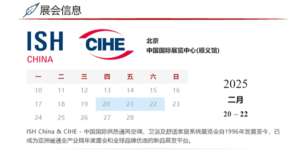 ISH China & CIHE – 中國國際供熱通風(fēng)空調(diào)、衛(wèi)浴及舒適家居系統(tǒng)展覽會(簡稱:中國供熱展)自1996年發(fā)展至今,正逐漸發(fā)展成為亞洲暖通、空調(diào)、熱泵與舒適家居行業(yè)的年度盛宴。在展會規(guī)模擴(kuò)大過程中,受到辦展條件等多方面制約,展期從年初調(diào)整至了每年5月。而隨著辦展條件逐步改善,展期重回年初的條件逐漸成熟,應(yīng)行業(yè)同仁們多年來的建議與呼聲,并期待能更好的配合行業(yè)的年度采買規(guī)劃,助力展商及時把握開年市場機遇,在眾多行業(yè)協(xié)會與合作單位的鼎力支持下,ISH China & CIHE中國供熱展重磅定檔2025年2月20至22日,在北京中國國際展覽中心(順義館)揚帆領(lǐng)航。