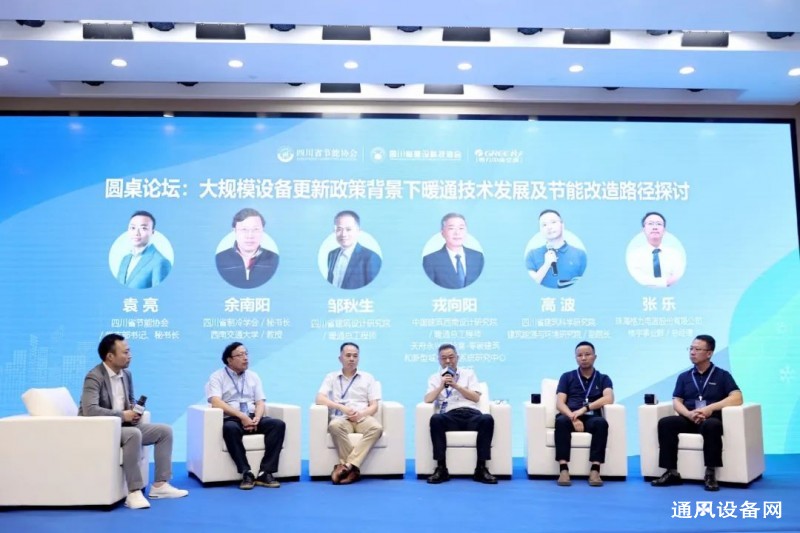 由四川省節(jié)能協(xié)會黨支部書記/秘書長袁亮主持的圓桌論壇環(huán)節(jié),邀請了中國建筑西南設計研究院有限公司暖通總工程師/天府永興實驗室-零碳建筑和新型城鄉(xiāng)能源系統(tǒng)研究中心執(zhí)行主任戎向陽、四川省建筑設計研究院有限公司暖通總工程師鄒秋生、四川省制冷學會秘書長/西南交通大學教授余南陽、四川省建筑科學研究院有限公司建筑能源與環(huán)境研究院副院長高波、珠海格力電器股份有限公司樓宇事業(yè)群總經(jīng)理張樂,共同圍繞《大規(guī)模設備更新政策背景下暖通技術更新及改造》進行交流對話。