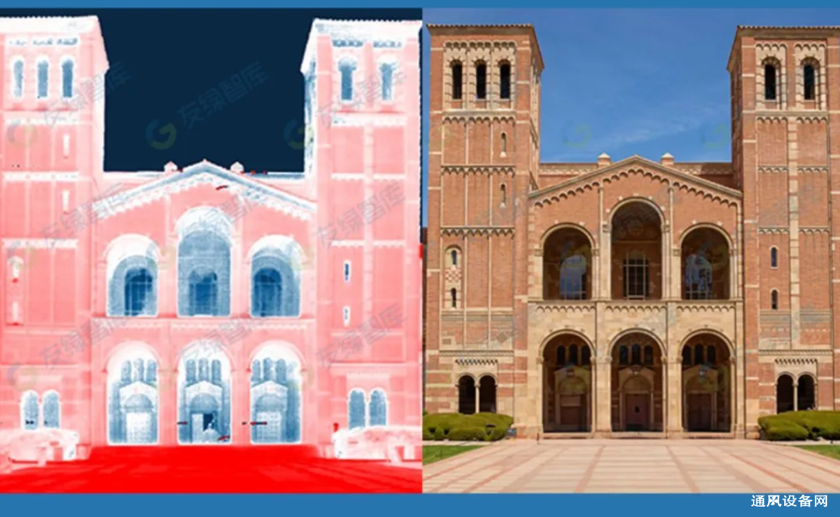 熱紅外圖像揭示了輻射熱。立面從地面(紅色)吸收熱量(白色至淡紅色),而來自地面/建筑物的一些熱量則輻射到寒冷的天空(藍(lán)色)。