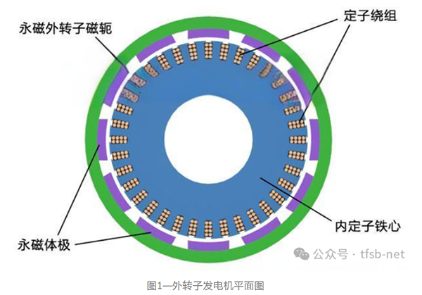 外轉子電機的特點是定子固定在靠軸中間位置不動,轉子在定子的外圍旋轉,也屬徑向氣隙磁通結構,與內轉子結構相比是轉子與定子換了個位置,圖1是外轉子發(fā)電機平面圖,定子在電機內部稱為內定子,轉子在電機外周,稱為外轉子。