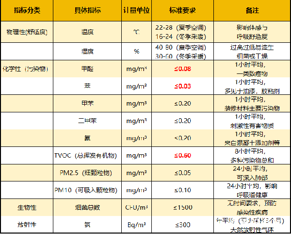 以下是與生活息息相關(guān)的關(guān)鍵指標(biāo),涵蓋污染物、舒適度、放射性等類別,數(shù)據(jù)直接參考國(guó)標(biāo)原文: