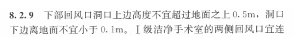 GB50333-2013《醫(yī)院潔凈手術(shù)部建筑技術(shù)規(guī)范》作為強制性國家標準,對回風口的設置作出了明確規(guī)定,其中第8.2.9條提到關(guān)于下部回風口洞口高度的要求——“下部回風口洞口上邊高度不宜超過地面之上0.5m,洞口下邊離地面不宜小于0.1m”。