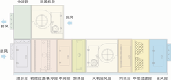 以下是凈化中央空調(diào)功能段組合演示:包括回風(fēng)機(jī)段+分流段+混合初效段+表冷段+中間段+加熱段+風(fēng)機(jī)段+均流段+中效出風(fēng)段。