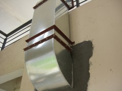 采用40*40*4角鐵架與墻或窗板螺栓田賽接,風(fēng)管與角鐵架間墊橡膠防振,且所有縫隙均用玻璃或水泥沙漿密封。送風(fēng)彎管要按圖紙要求做好,截面積要求不能小于0.45平方米。安裝風(fēng)管時(shí)要在安裝底架上安裝吊桿,使風(fēng)管重量全部吊裝在底架上。