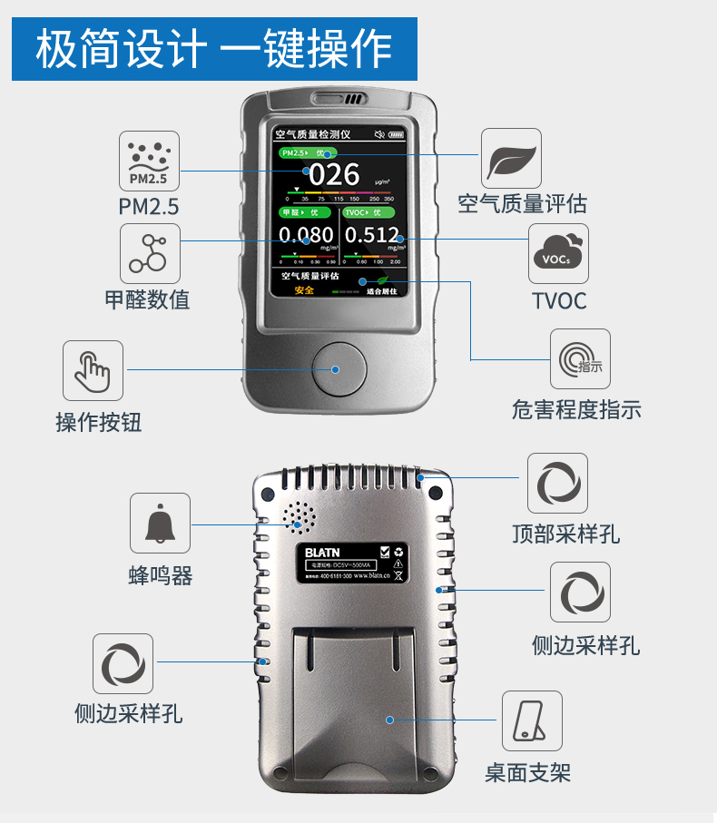 甲醛采用高精度電化學傳感器,分辨0.01mg/m3甲醛分子。