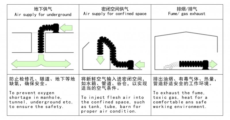 2、 通風管任意彎轉(zhuǎn)、駁接自由、體積輕巧、攜帶方便;