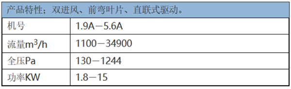 外轉(zhuǎn)子、前彎葉片、雙進(jìn)口,尺寸由190~560mm,風(fēng)量1100~34900m³/h,全壓130~1244Pa。